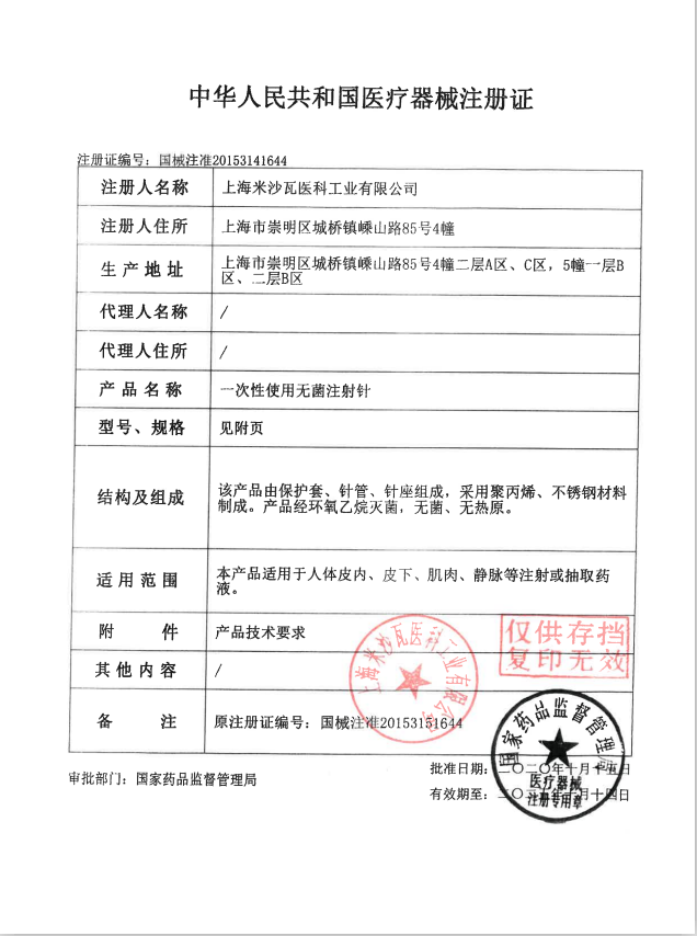 上海米沙瓦医科工业有限公司主要生产和销售各种规格的一次性使用无菌注射针、一次性使用无菌注射器、一次性使用输液器、一次性使用静脉输液针和胰岛素注射器、双联混药包、自毁式注射器器等一次性使用的医疗器具和医用穿刺器具。一次性使用无菌注射器,已得到美国FDA确认,取得了(510K)销售证书,产品已销往美国、欧州等发达国家。